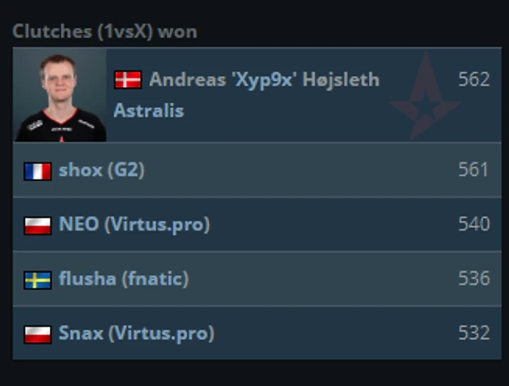 Игрок Astralis Андреас «Xyp9x» Хойслет выиграл наибольшее количество ситуаций 1 в X среди всех профессиональных игроков CS:GO.