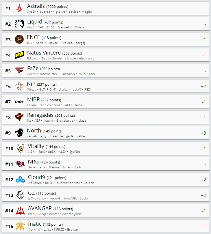 Ence поднялась на третье место, опередив Na`Vi. NiP взлетели на шестую строчку, а North – на девятое. После попадания на DreamHack Masters Dallas G2 поднялась на 13 позицию. Hellraisers вернулись в топ-30 и теперь находятся на 29-м месте.