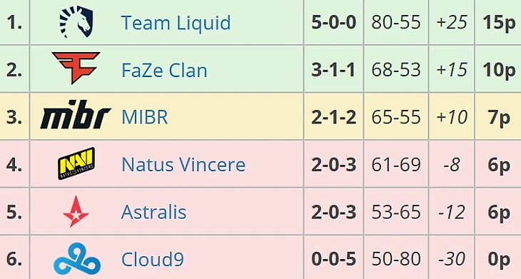 00:00 MIBR 8:16 Na`Vi00:00 Astralis 16:10 Cloud900:00 Team Liquid 16:5 Faze Clan 01:30 Cloud9 14:16 Team Liquid01:30 Faze Clan 15:15 MIBR01:30 Astralis 16:7 Na`Vi