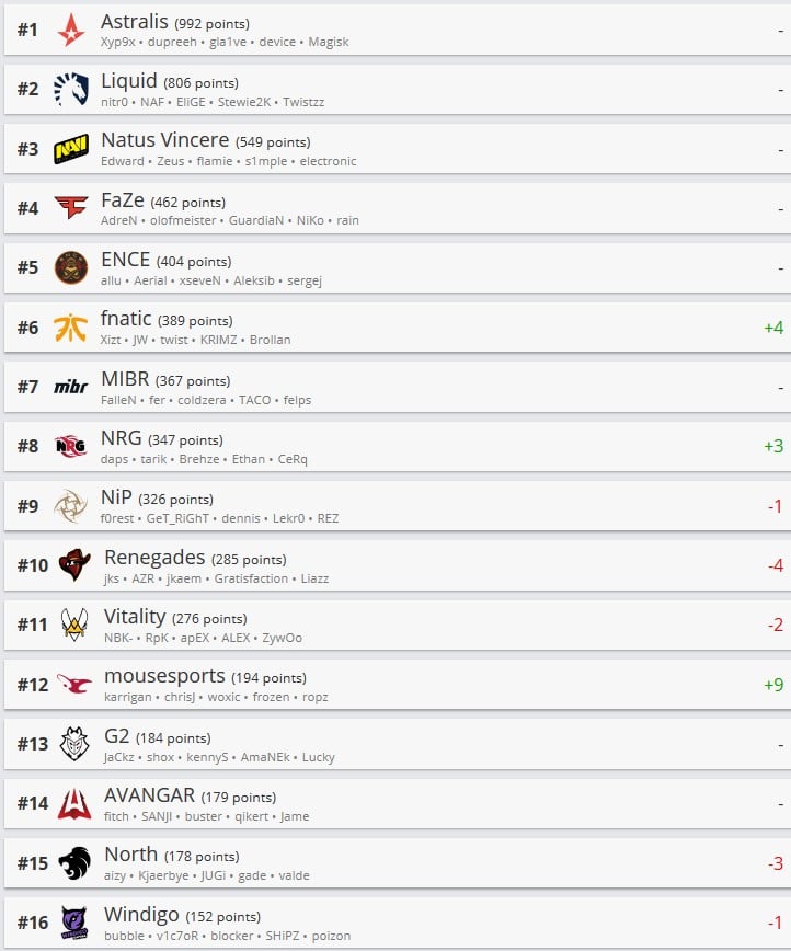 В рейтинге поднялись Fnatic (+4, 6-е место), Mousesports (+9, 12-е место), NRG (+3, 8-е место), Spirit (+4, 25-е место) и MVP PK (+19, 26-е место). Наибольший рост показала Grayhound, поднявшаяся с 50-го места на 19-е.