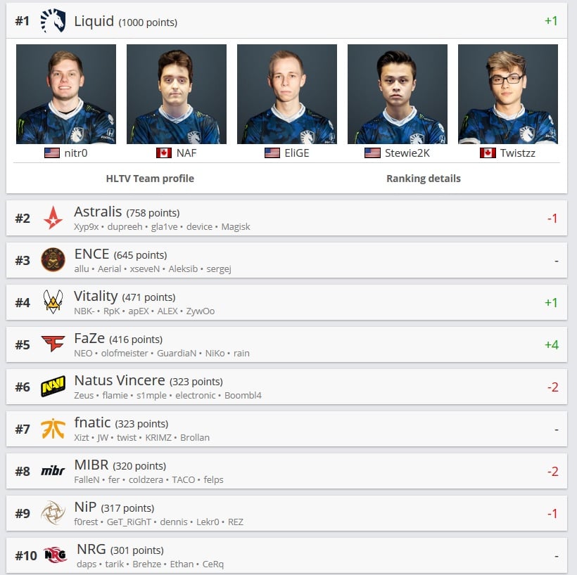 Astralis лидировала в рейтинге с 23 апреля 2018 года. У датской команды 758 очков, а у Team Liquid – 1 тысяча. На турнире в Далласе Liquid набрала 201 очко.