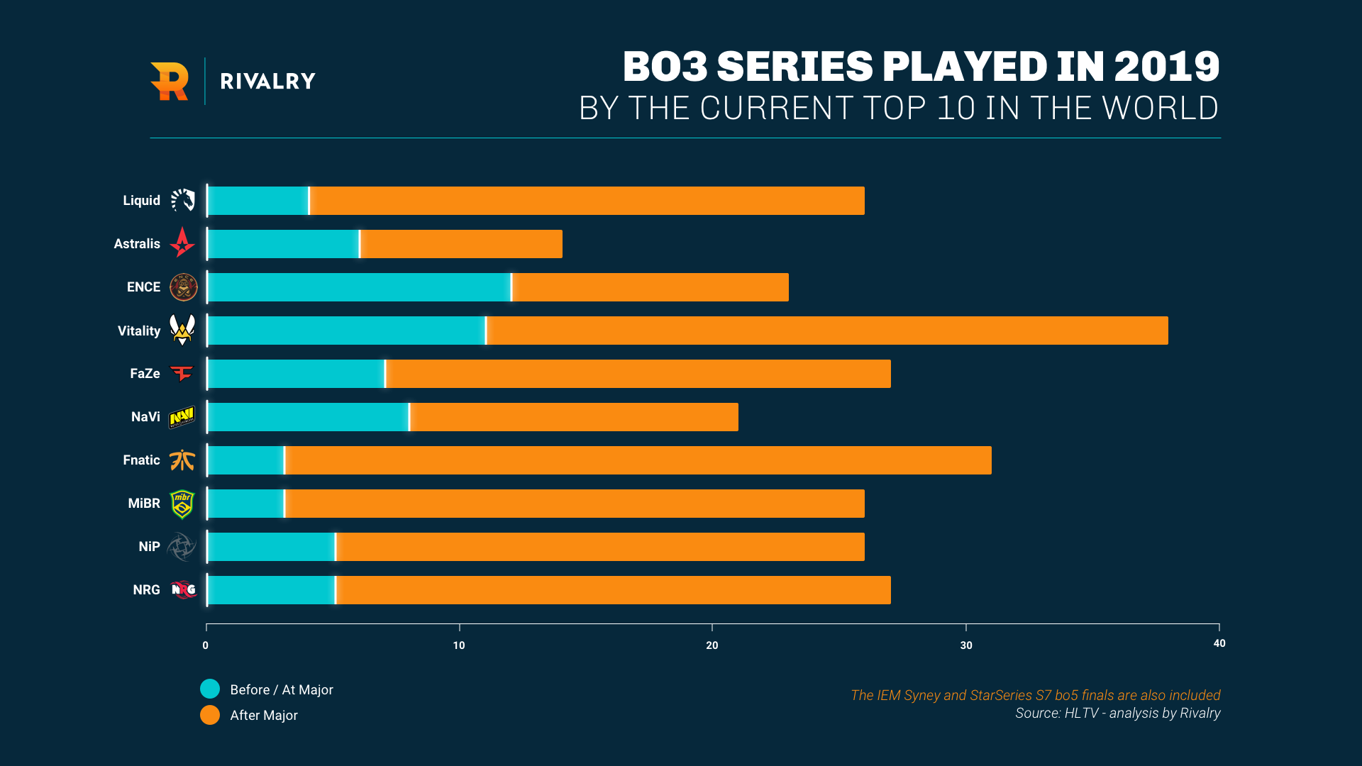 Портал Rivalry подсчитал, сколько матчей bo3 сыграли команды из топ-10 рейтинга HLTV в этом году.