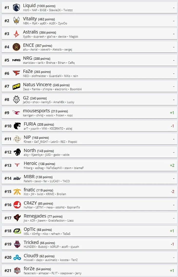 В топ-10 произошло только одно изменение: Mousesports и Furia поменялись местами. Теперь команда Финна «Karrigan» Андерсена занимает девятое место. Бразильская команда опустилась на десятую позицию.