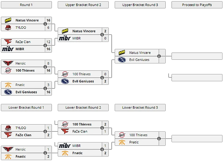 14:00 Natus Vincere 16:6 TyLoo / первый раунд группы А14:00 FaZe Clan 12:16 MIBR / первый раунд группы А15:15 Heroic 8:16 100 Thieves / первый раунд группы А15:15 fnatic 3:16 Evil Geniuses / первый раунд группы А16:30 Astralis 16:8 Renegades / первый раунд группы Б16:30 G2 16:13 Sharks / первый раунд группы Б17:45 mousesports 16:9 ATK / первый раунд группы Б17:45 North 12:16 Liquid / первый раунд группы Б19:00 Natus Vincere 2-0 MIBR / второй раунд верхней сетки группы А19:00 TyLoo 1-2 Faze Clan / первый раунд нижней сетки группы А22:35 100 Thieves 0-2 Evil Geniuses / второй раунд верхней сетки группы А22:35 Heroic 1-2 Fnatic / первый раунд нижней сетки группы А