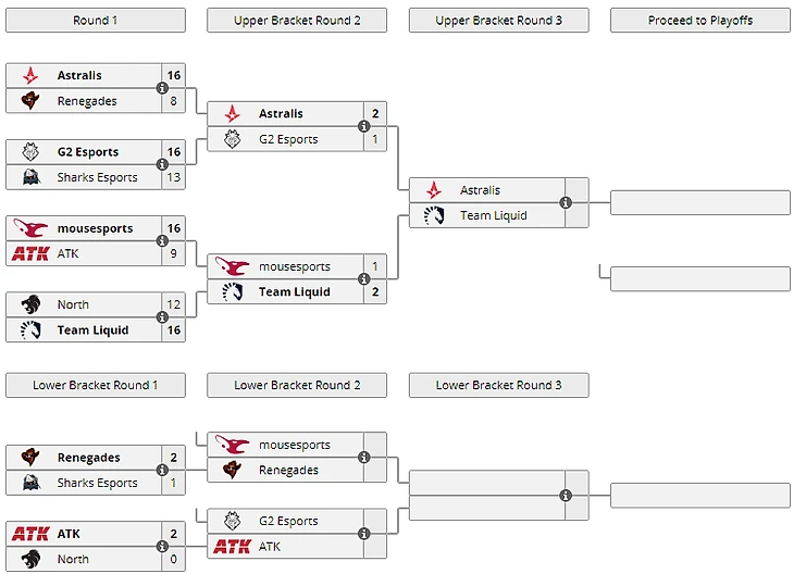 14:00 Renegades 2-1 Sharks / первый раунд нижней сетки группы Б14:00 ATK 2-0 North / первый раунд нижней сетки группы Б17:35 Astralis 2-1 G2 / второй раунд верхней сетки группы А17:35 Faze Clan 1-2 100 Thieves / второй раунд нижней сетки группы А21:10 mousesports 1-2 Liquid / второй раунд верхней сетки группы А21:10 MIBR 1-2 Fnatic / второй раунд нижней сетки группы Б