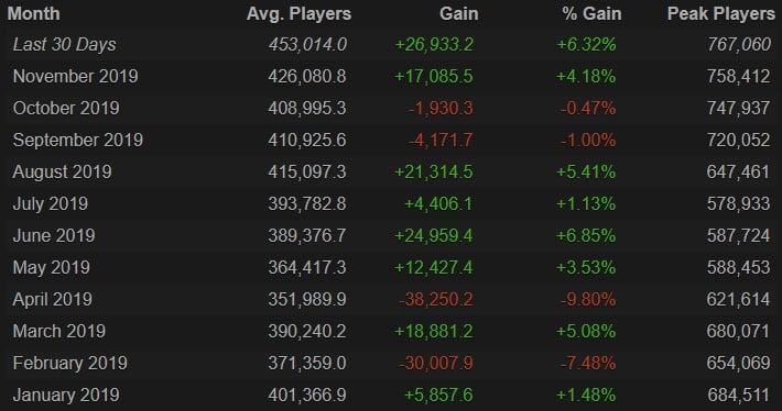 По данным Steam Charts, за декабрь показатель среднего онлайна увеличились на 6,32%.