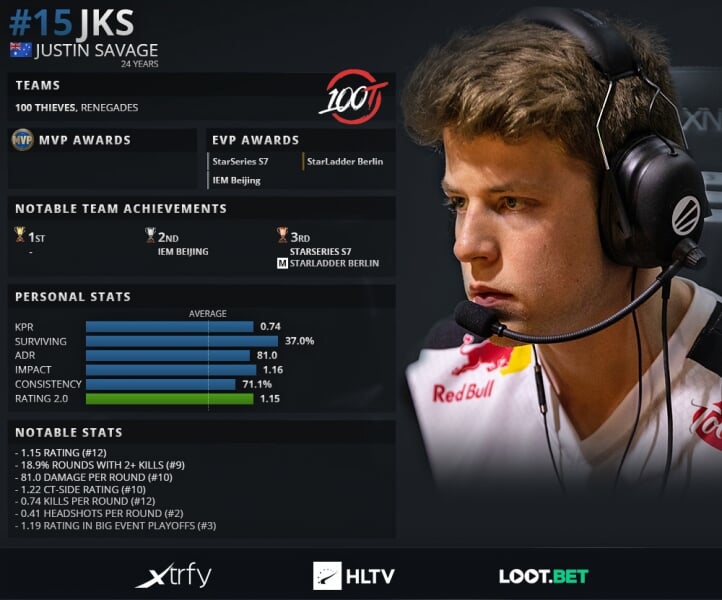 Игрок 100 Thieves Джастин «jks» Севейдж занял 15-е место в рейтинге HLTV за 2019 год.
