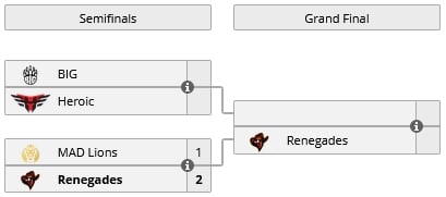 12:00 MAD Lions 1-2 Renegades / полуфинал15:00 BIG 2-0 Heroic / полуфинал19:00 Renegades 0-2 BIG / финал