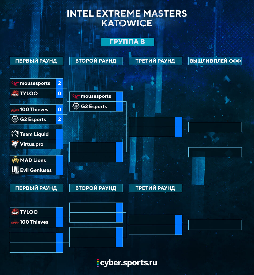 Группа Б: 100Thieves, G2, Mousesports, TyLoo, Liquid, Virtus.pro, MAD Lions, Evil Geniuses.