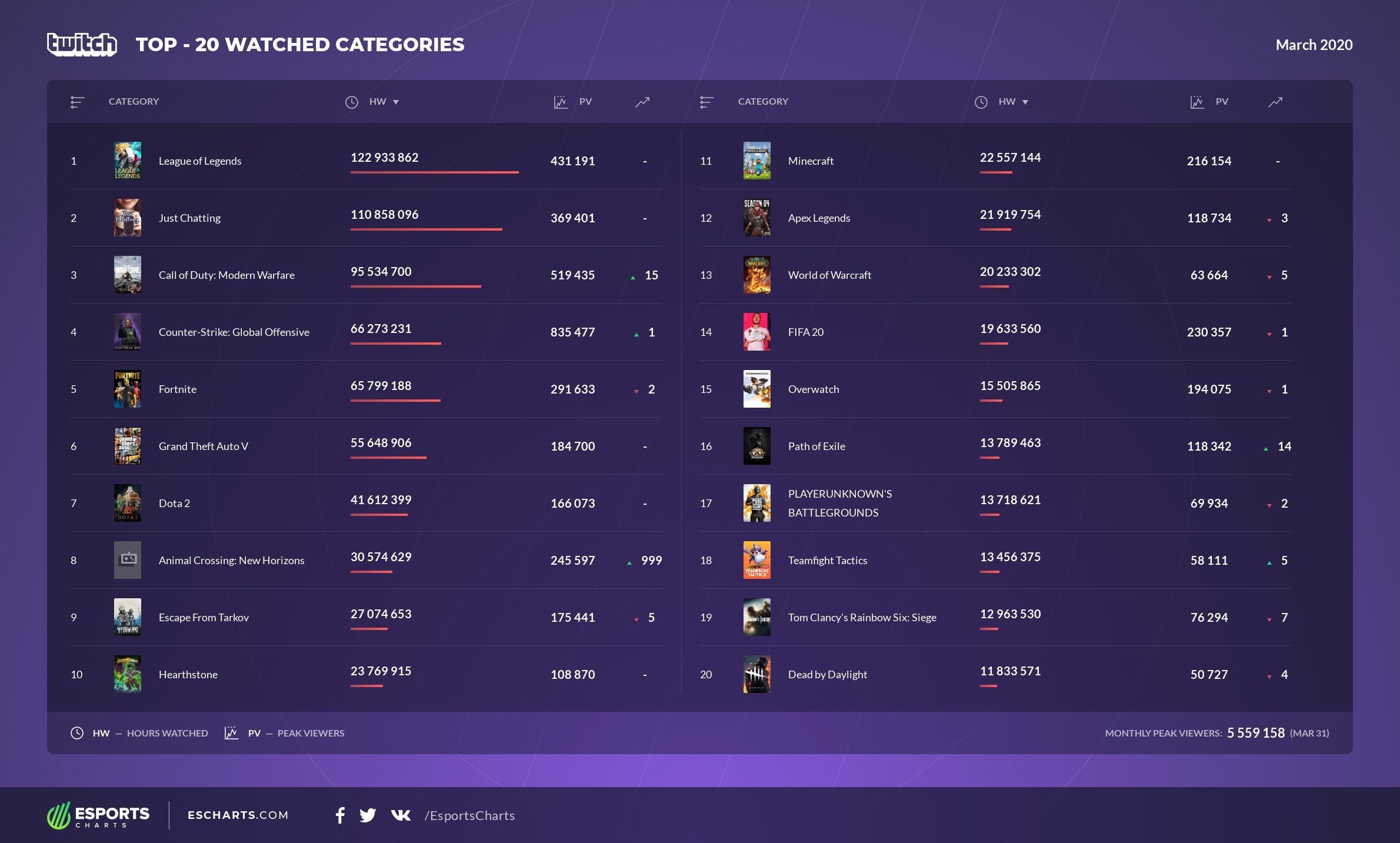 Сайт Esports Charts представил статистику просмотров категорий на Twitch в марте.