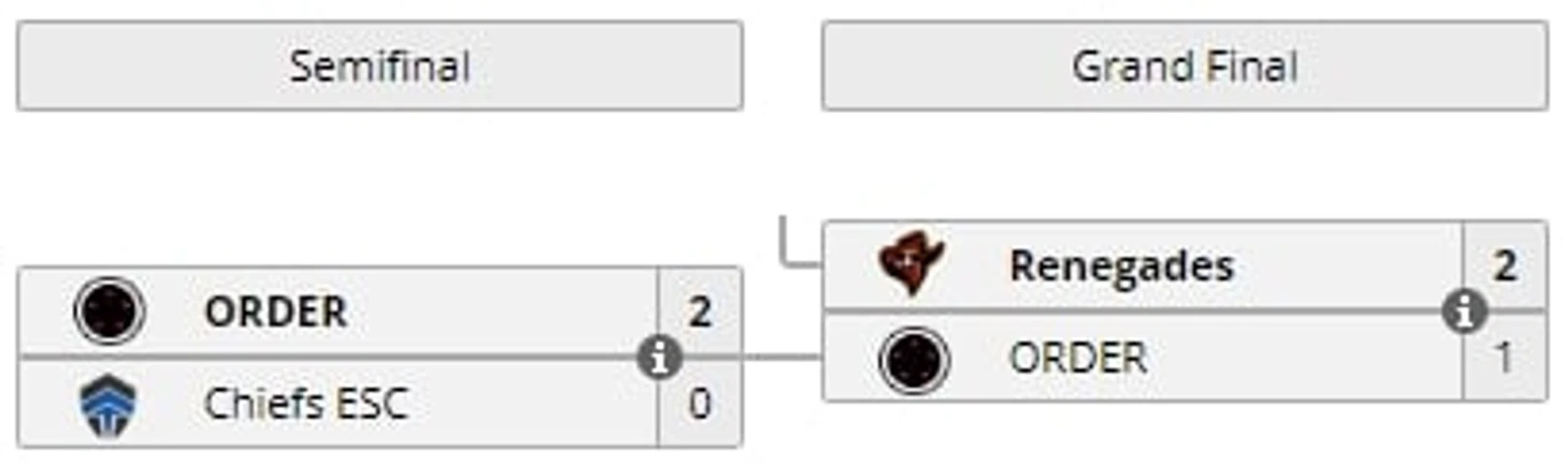 В финальном матче Renegades обыграла ORDER со счетом 2-1 по картам (7:16 на Train, 22:20 на Inferno и 16:12 на Dust 2).