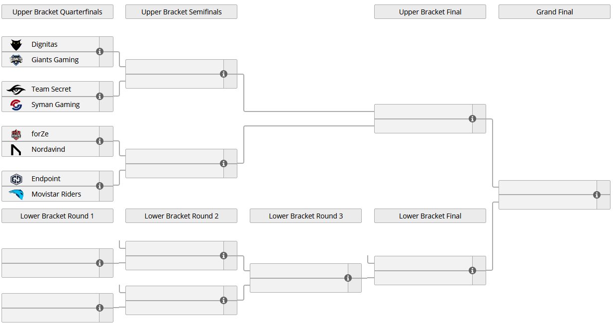В группу A попали Dignitas, Giants, Secret, Syman, Forze, Nordavind, Endpoint и Movistar Riders.