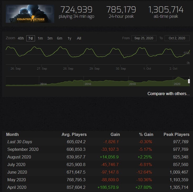 В августе онлайн показал незначительный рост по сравнению с показателями прошлых месяцев, а значительное повысился онлайн в CS:GO весной 2020 года после начала пандемии коронавируса.