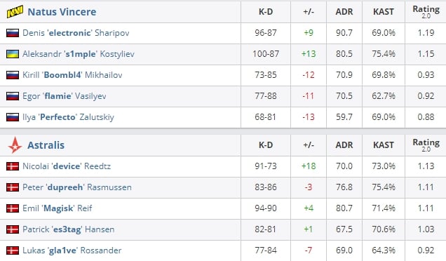 Лучшими игроками финального матча по рейтингу стали игроки NAVI: Денис «Electronic» Шарипов и Александр «S1mple» Костылев.
