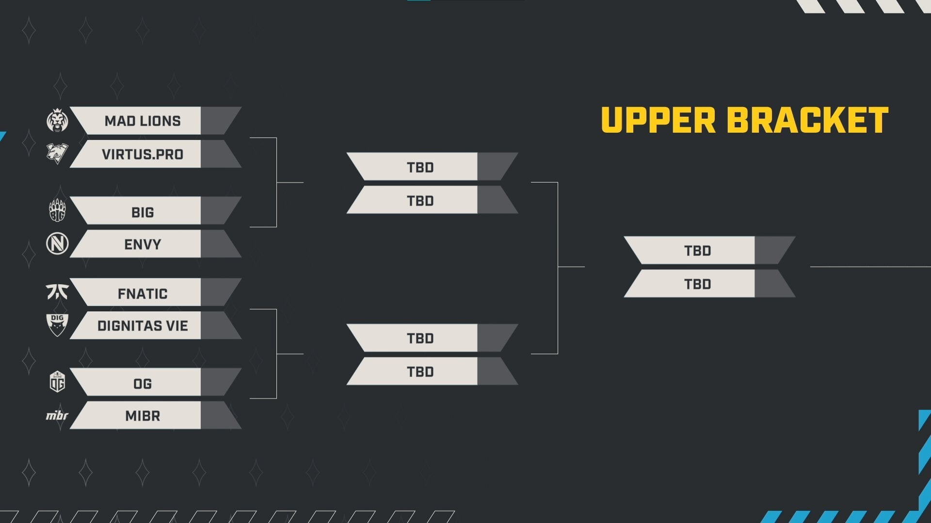 Единственный представитель СНГ – Virtus.pro – встретится в 1/4 финала верхней сетки с Mad Lions. Остальные пары: BIG – Envy, Fnatic – Dignitas, OG – MIBR.
