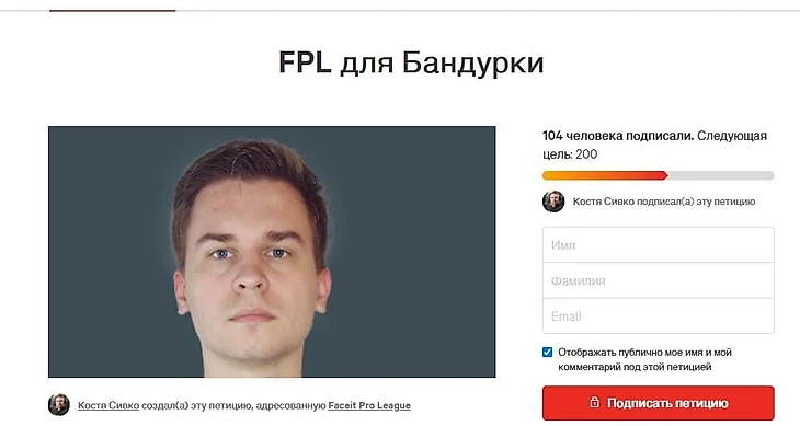 Leninw призвал добавить игрока Espada Дмитрия «Dima» Бандурку в FACEIT Pro League – закрытую лигу для игроков про-сцены и геймеров, прошедших отбор. Сивко опубликовал петицию на сайте change.org и отметил в качестве адресата саму FPL.