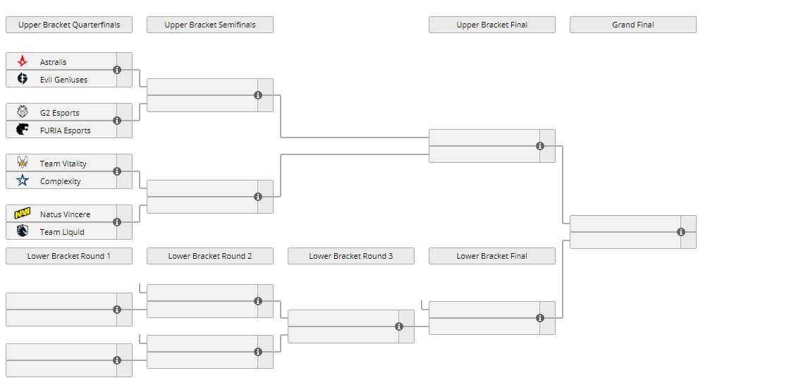В 1/4 верхней сетки плей-офф NAVI встретятся с Liquid, Vitality – с Complexity, G2 – с Furia, а Astralis сыграют против Evil Geniuses.