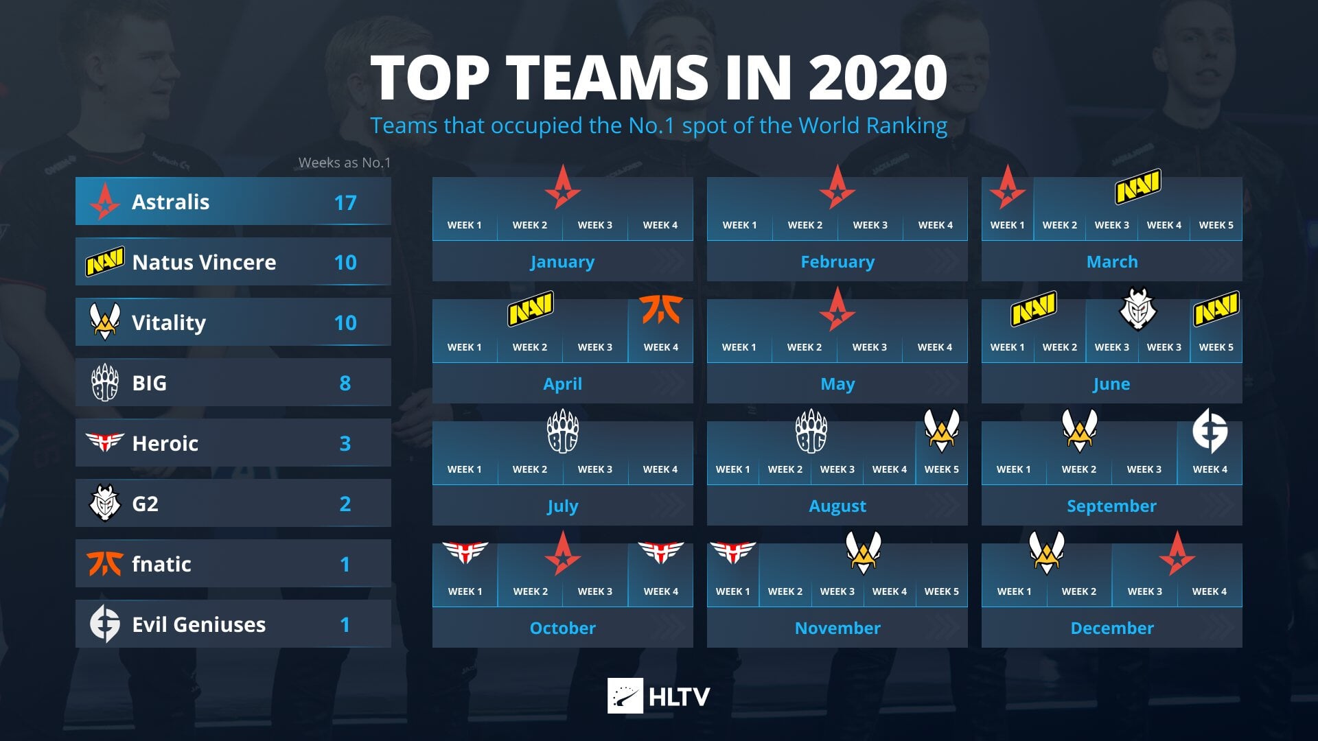 HLTV опубликовал статистику команд, занимавших первую строчку мирового рейтинга по CS:GO за 2020 год.