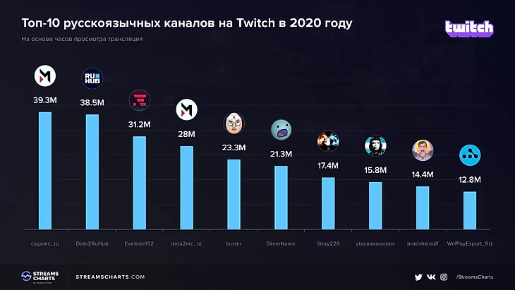Самым популярным каналом на русском языке стал CS:GO Maincast с 39,3 млн часов просмотров за прошедший год. На втором месте оказался Dota2RuHub, в общей сложности собравший 38,5 млн часов просмотров в 2020-м, третьим стал канал Вадима «Evelone» Козакова (31,2 млн).