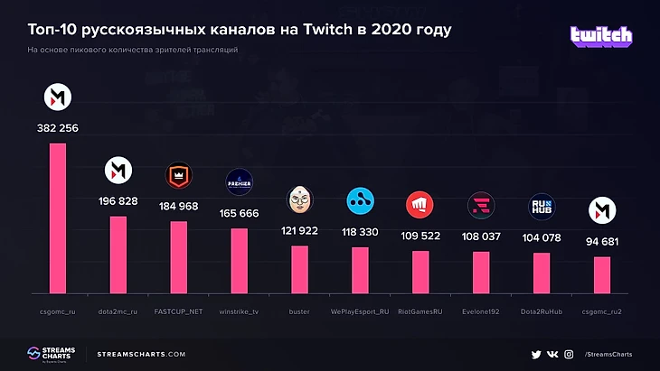 Сайт Streams Charts опубликовал данные о просмотрах русскоязычных каналов на Twitch за 2020 год.