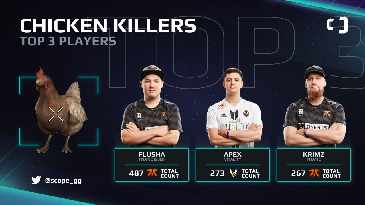 Сайт Scope.gg представил статистику убитых куриц на про-сцене в CS:GO в 2020 году.