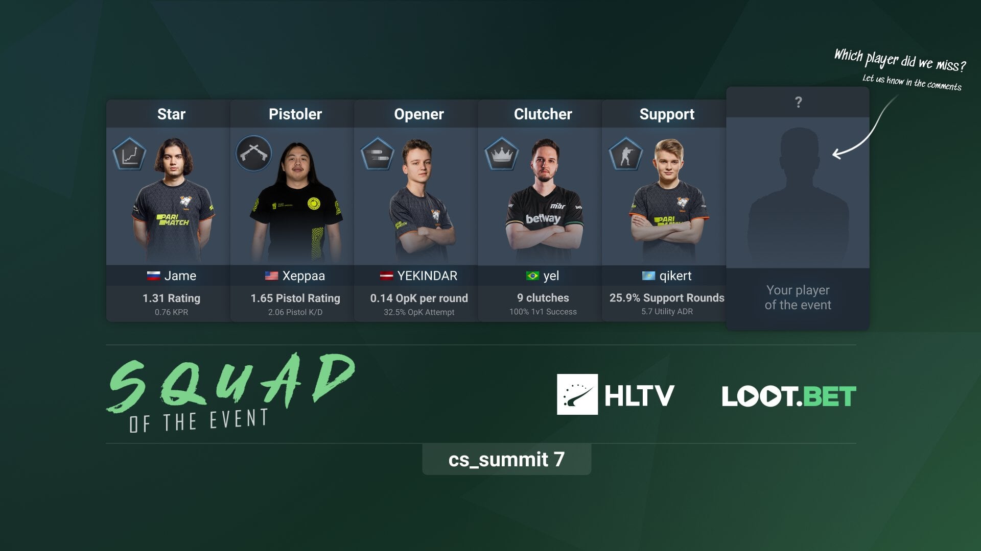 Также в команду турнира вошли Эрик «Xeppaa» Бах из Cloud9 в качестве лучшего игрока на пистолетных раундах и Густаво «yeL» Ниттел из MIBR как главный клатчер турнира (9 клатчей, 100% винрейт в дуэлях 1-на-1).