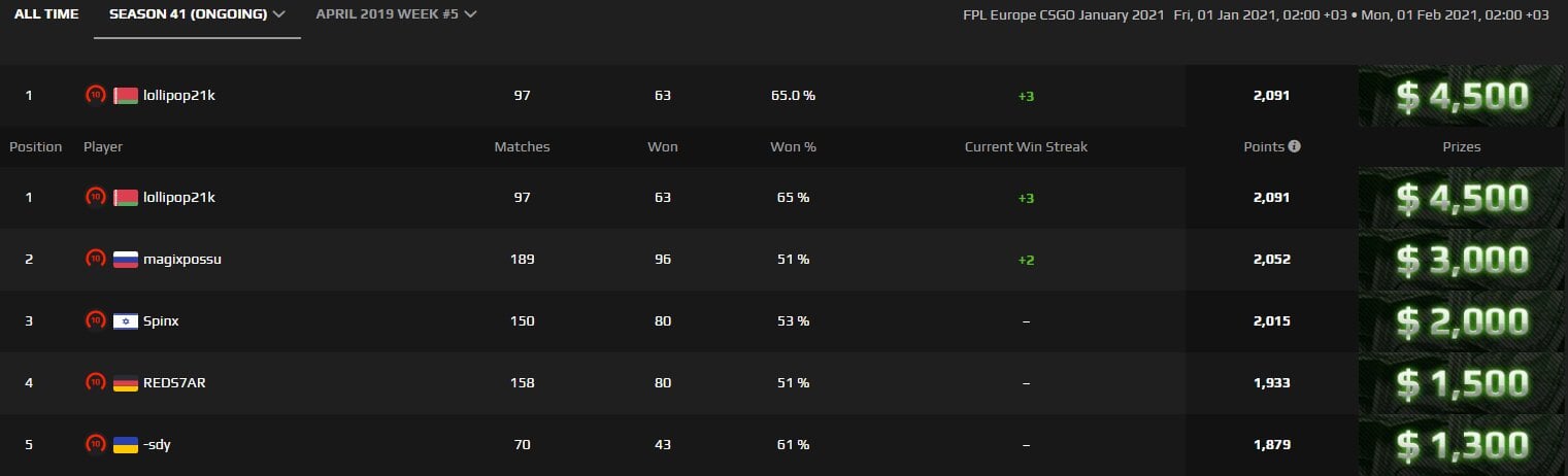Благодаря победе в европейском дивизионе FPL, Солодков получил 4,5 тысячи долларов. Второе место в рейтинге занял Борис «magixx» Воробьев из Team Spirit, а на пятой строчке оказался его тиммейт Виктор «somedieyoung» Оруджев.