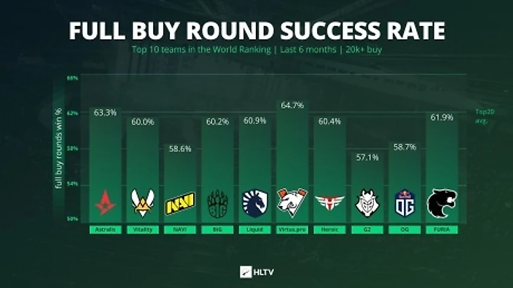 Российский клуб выиграл 64,7% раундов с общей закупкой более чем на 20 тыс. долларов. Второе место в рейтинге заняла Astralis, которая побеждает в 63,3% раундов. Тройку лидеров замкнула Furia с показателем 61,9%.