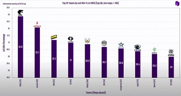 За 176 сыгранных карт коллектив имеет 32,9% побед в ситуациях 4 на 5. Второе место в рейтинге заняла Astralis – 32,1% победа за 191 карту. Тройку лидеров замкнула NAVI, которая имеет в своем активе 31,2% побед за 211 сыгранных карт.