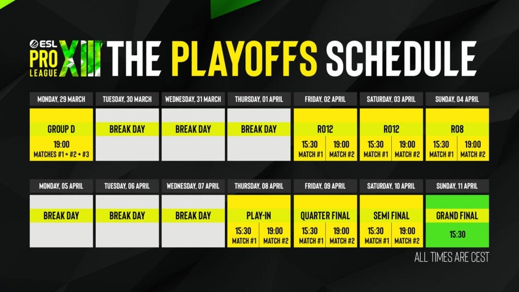 Также ESL опубликовала и расписание сетки плей-офф: после завершения матчей в группе D, в турнире наступит трехдневный перерыв. Далее пройдет две первых стадии плей-офф, на которых сыграют вторые и третьи команды по итогам группового этапа. После еще одной трехдневной паузы стартует плей-ин для победителей групп, а также четвертьфиналы, полуфиналы и финал – он назначен на 11 апреля.