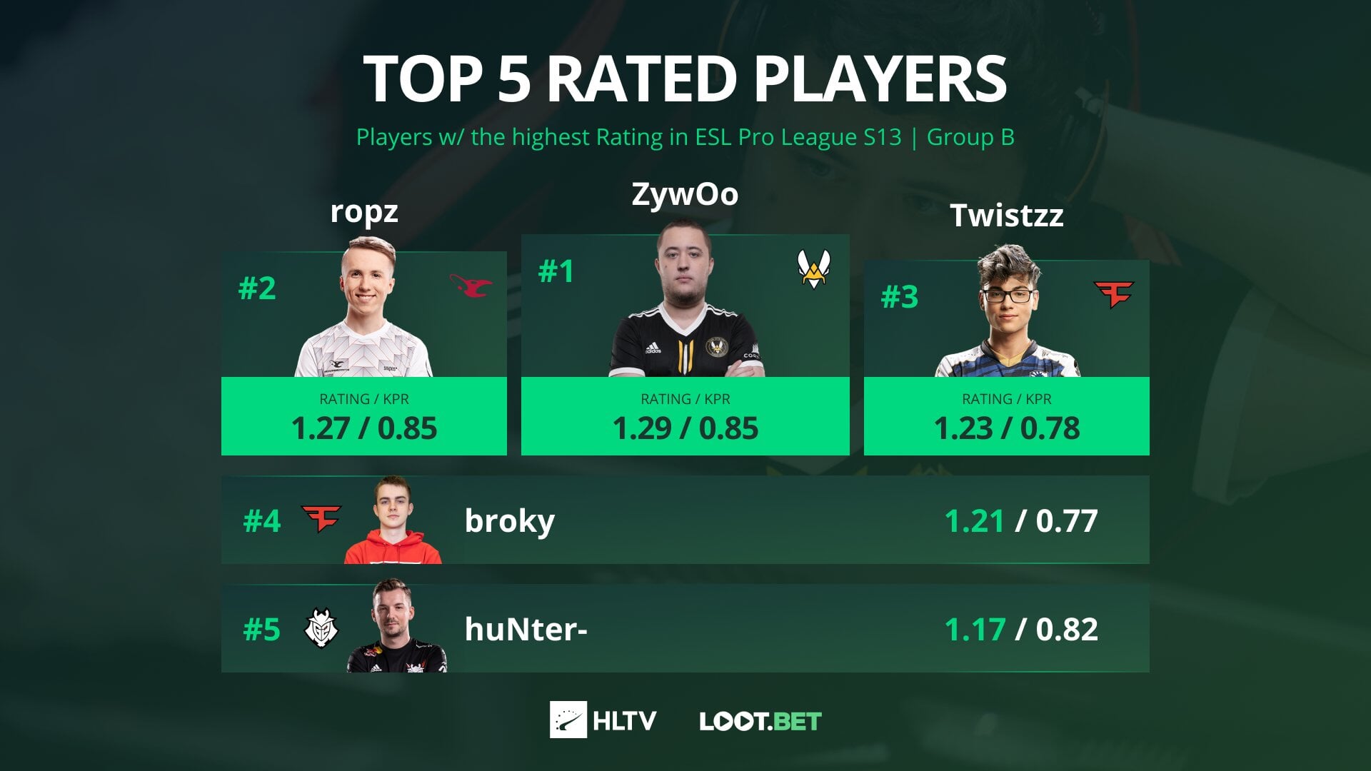 HLTV опубликовал список лучших игроков группы B на ESL Pro League Season 13 по рейтингу.