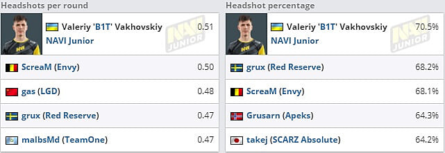 Шестой игрок NAVI Валерий «B1t» Ваховский возглавил рейтинг игроков по самому большому количеству и проценту хедшотов в раунде за всю историю CS:GO.