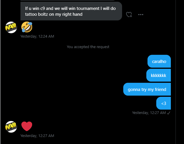 Капитан NAVI Кирилл «Boombl4» Михайлов в личном переписке с Рикардо «boltz» Прассом пообещал набить на правой руке татуировку с никнеймом бразильца, если MIBR обыграют Cloud9, а затем NAVI выиграют турнир.
