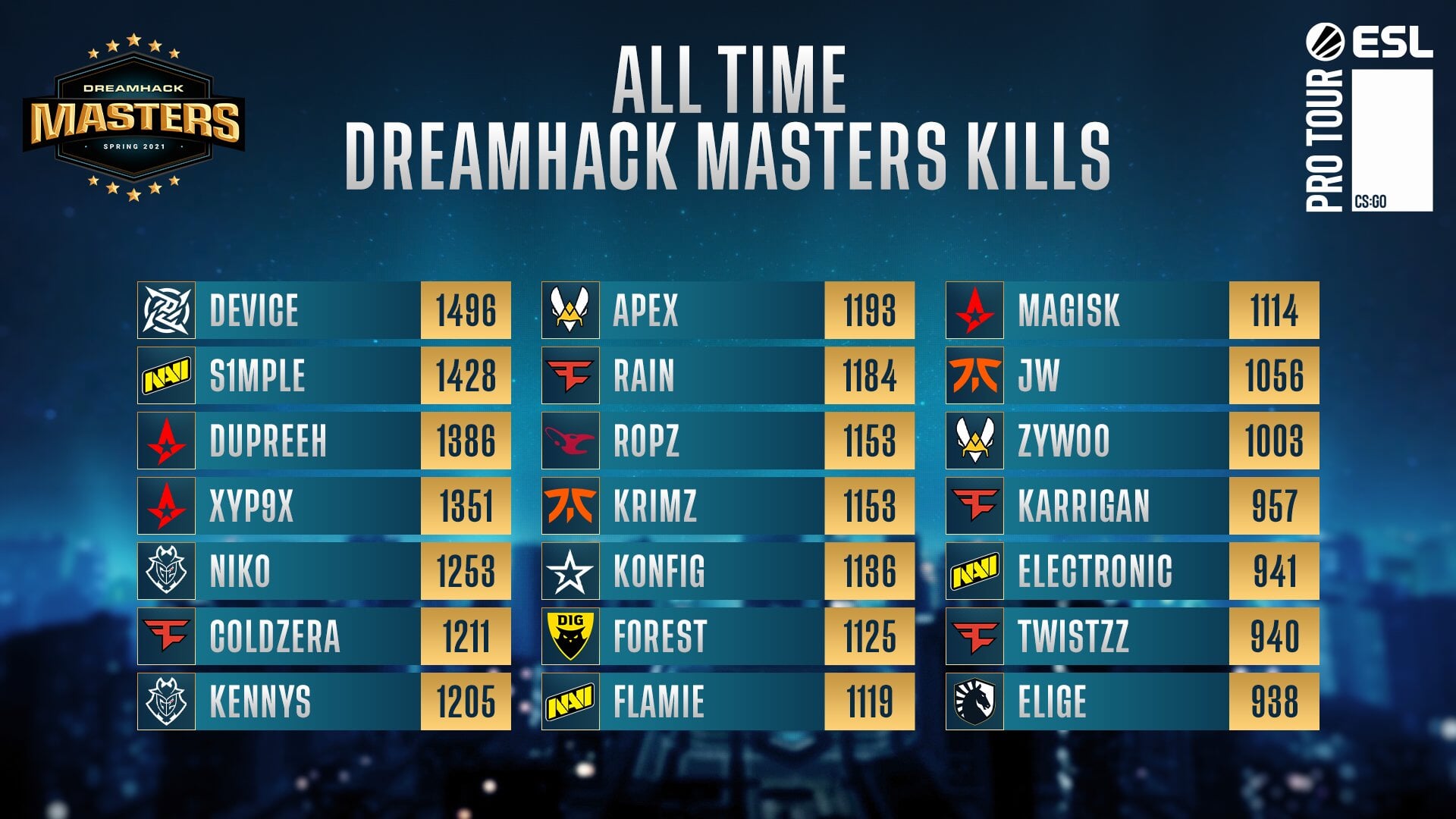 Возглавил список снайпер Ninjas in Pyjamas Николай «Device» Ридтц – он за карьеру совершил 1496 фрагов на турнирах DreamHack Masters. Вторым в топе оказался лидер NAVI Александр «S1mple» Костылев, оформивший 1428 убийств. Также в топе оказалось еще два игрока NAVI: Егор «Flamie» Васильев стал в списке 14-м (1119 фрагов), а Денис «Electronic» Шарипов –19-м (941 убийство).