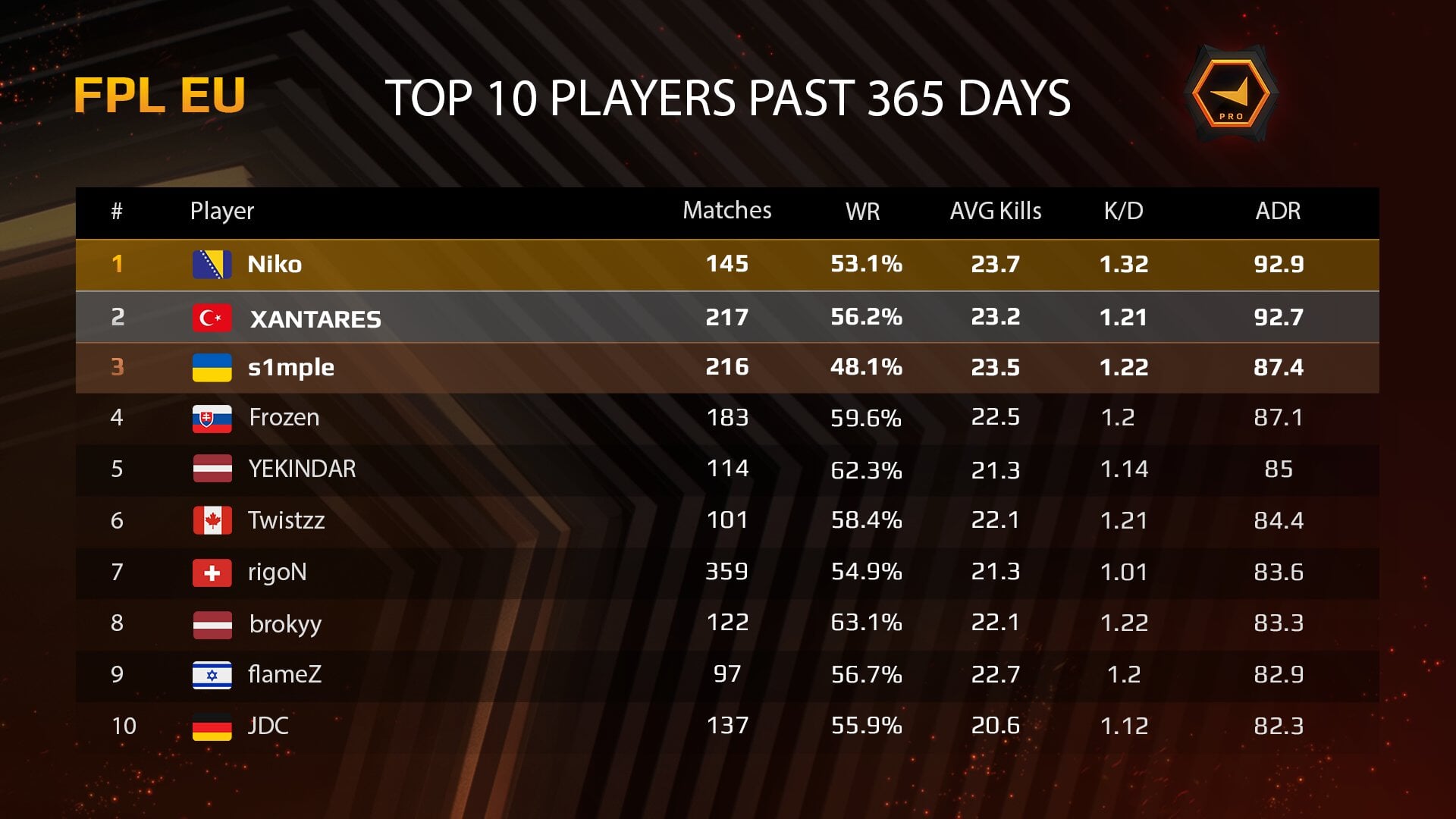 На второй строчке расположился Исмаилкан «XANTARES» Дурткардеш – 56,2% винрейт (217 матчей) при 1,21 K/D. Тройку лидеров замкнул снайпер NAVI Александр «s1mple» Костылев – 48,1% винрейт (216 матчей) при 1,22 K/D.