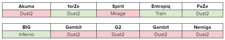 При этом команда не одержала ни одной победы на последних четырех Dust2 (против Gambit, G2 и Nemiga).