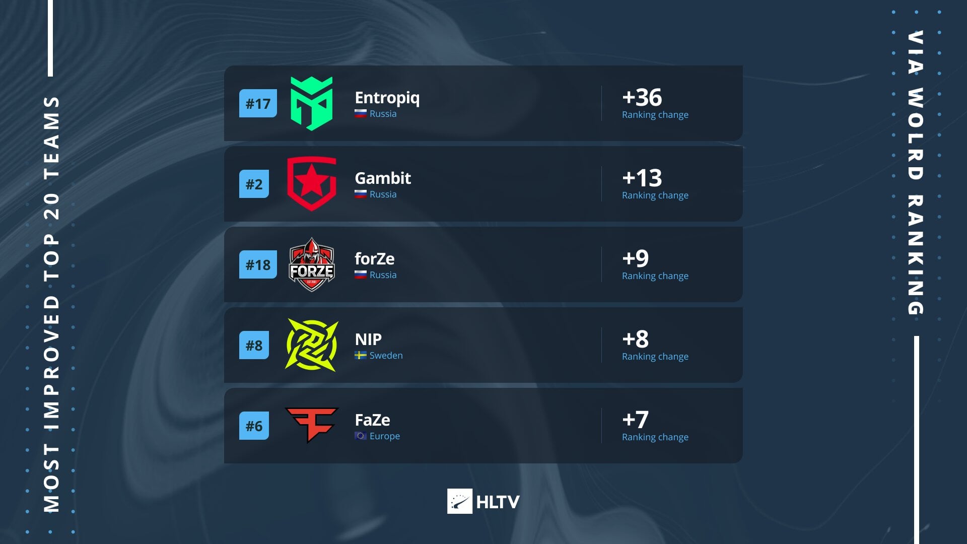 За 7 месяцев подопечные Дмитрия «Hooch» Богданова поднялись с 53-й на 17-ю позицию (+36). В топ-3 по росту также оказались Gambit (+13) и Forze (+9). Замкнули топ-5 Ninjas in Pyjamas и Faze Clan.