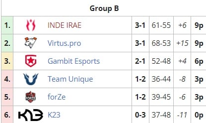 Команда обыграла Virtus.pro на Mirage со счетом 16:14. Текущая статистика Inde Irae – 3 победы в 4 матчах, Virtus.pro идет в таблице с такими же показателями.