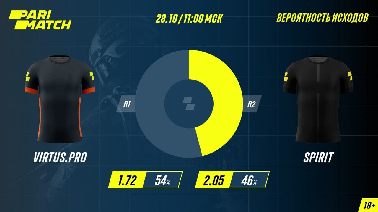 28 октября в Стокгольме состоится очередной матч в рамках PGL Major Stockholm 2021 по CS:GO, в котором друг против друга сыграют две команды из СНГ: Virtus.pro и Spirit. В букмекерской компании Parimatch, выступающей титульным партнером обеих коллективов, рассказали о ставках своих клиентов на предстоящую битву. Согласно оценке аналитиков, шансы Jame и ко победить чуть выше, чем у их соперников. Сделать ставку на VP можно с коэффициентом 1.72 (соответствует примерно 54%). Взять победу Spirit можно за 2.05 (46%).