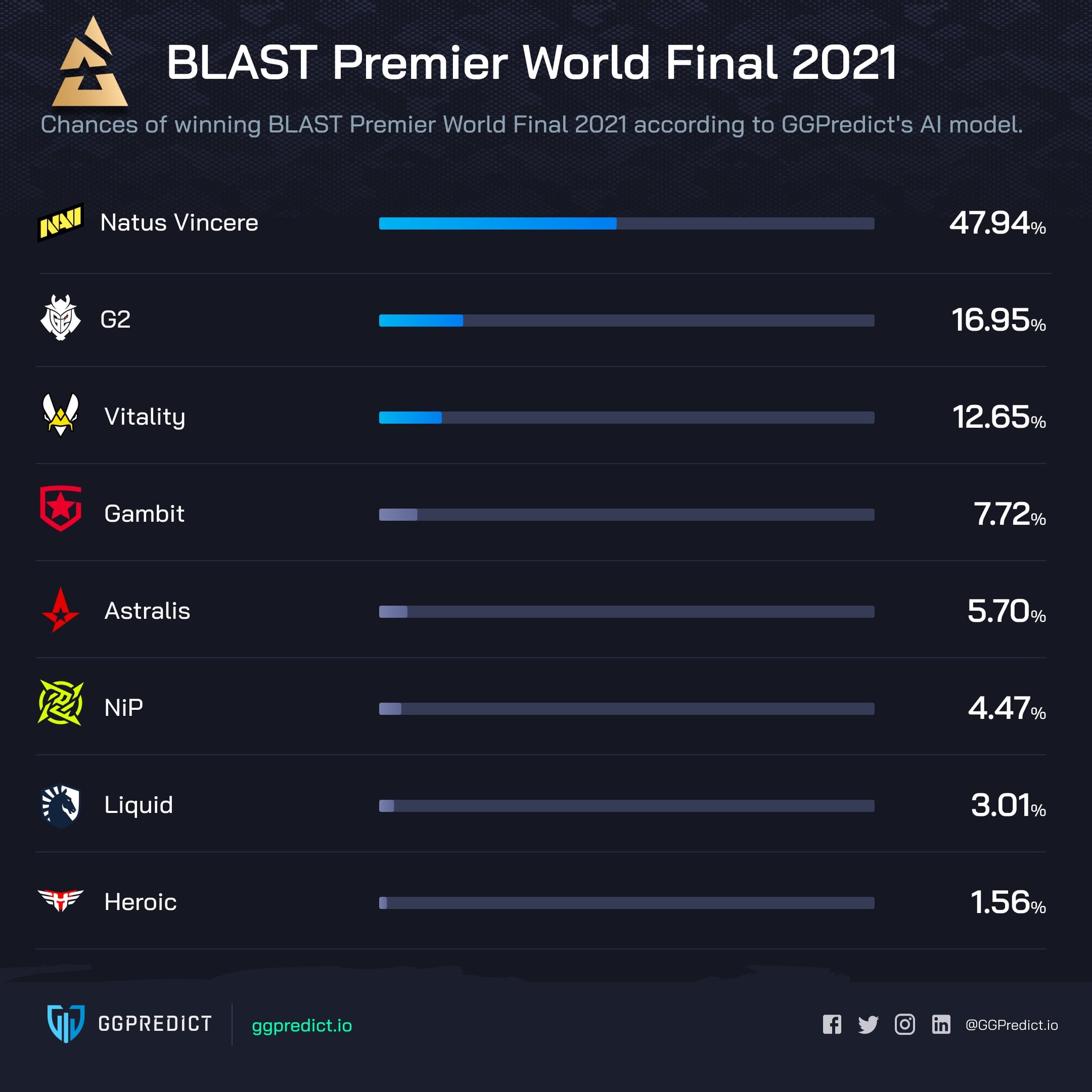 Аналитический сервис GGPredict использовал искусственный интеллект для симуляции результатов BLAST Premier: World Final 2021.