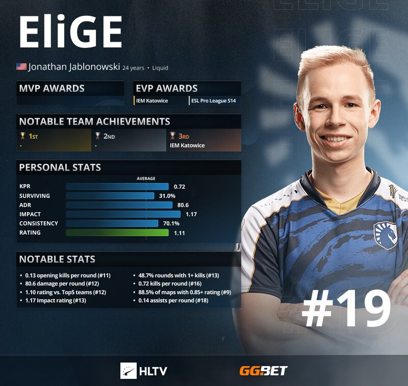 Рифлер Liquid Джонатан «Elige» Яблоновски оказался на 19-й строчке итогового топа игроков HLTV. Это его пятое попадание в список за карьеру.