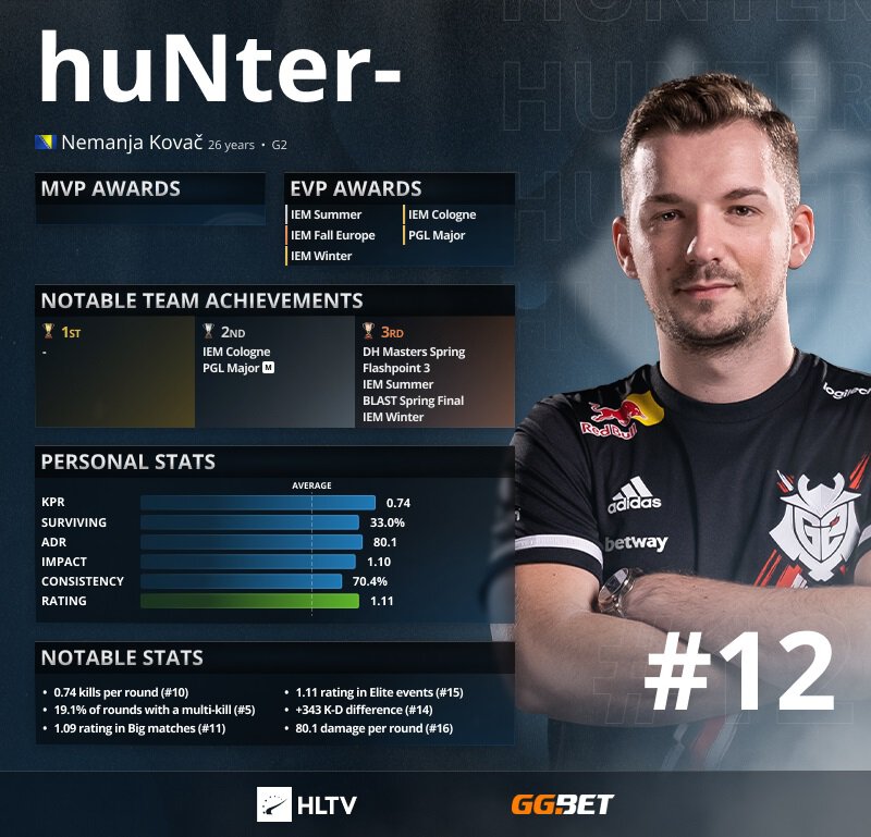 Игрок G2 Esports Неманья «Hunter» Ковач занял 12-е место в рейтинге HLTV за 2021 год.