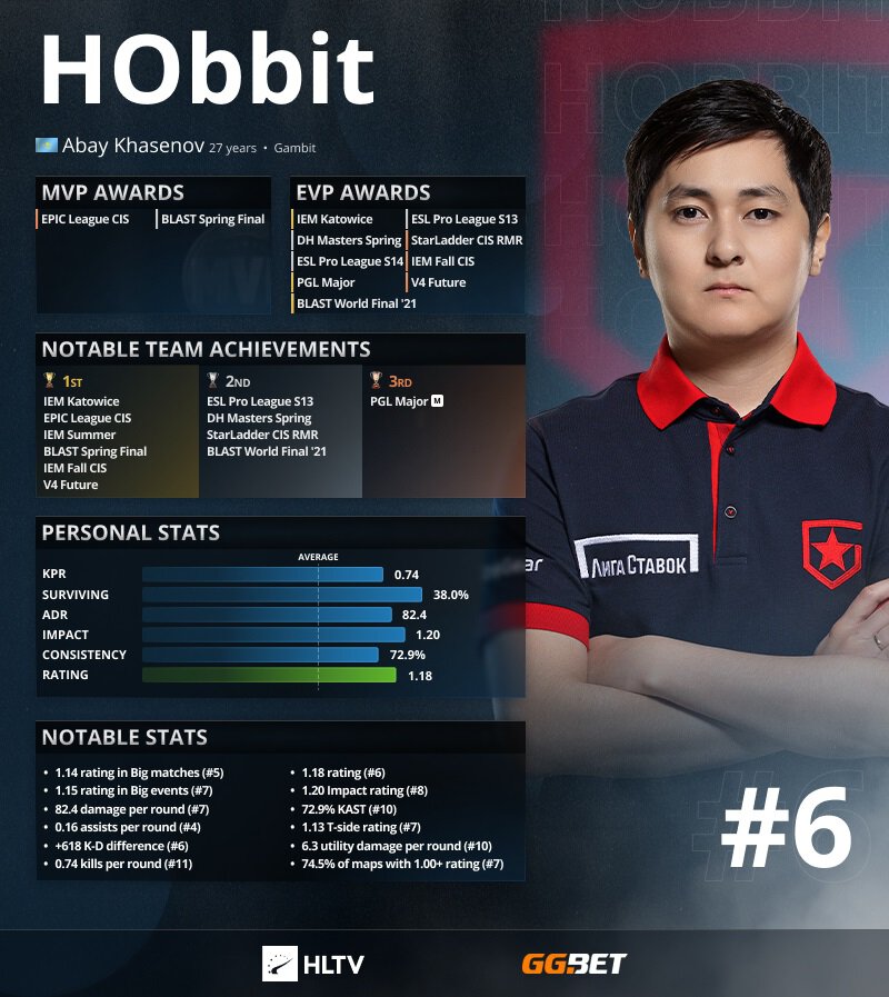 Рифлер Gambit Esports Абай «Hobbit» Хасенов занял 6-ю строчку в итоговом топе игроков по версии HLTV за 2021 год.