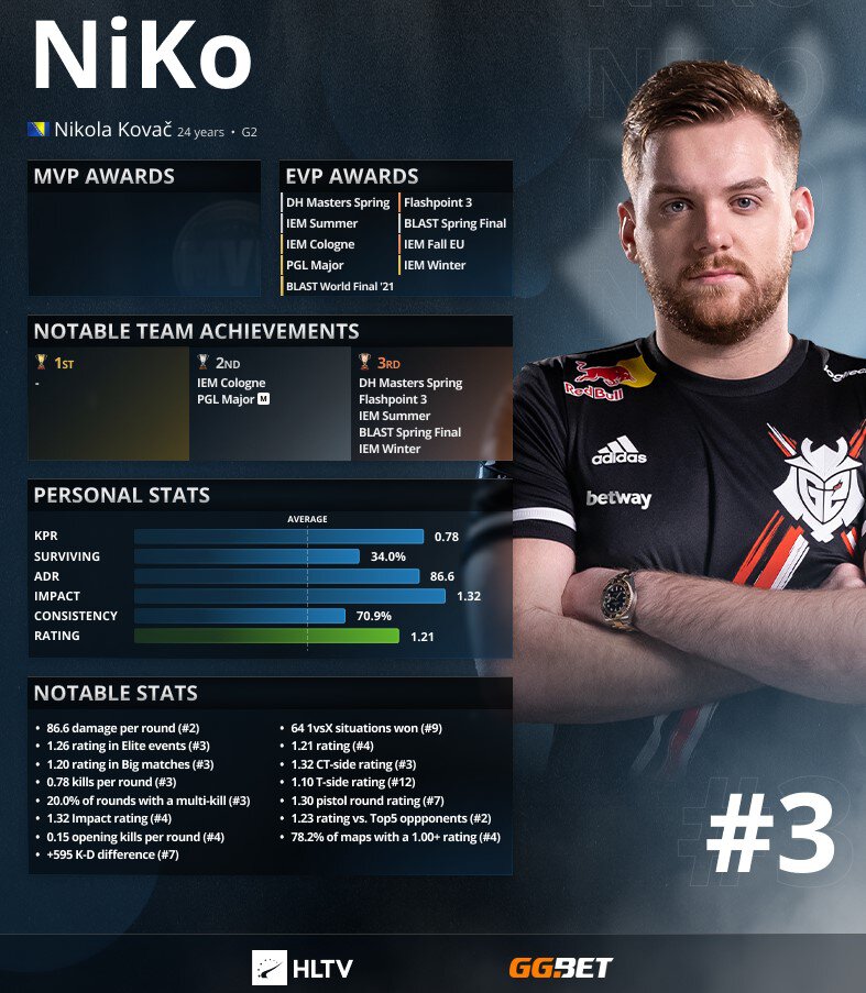 Рифлер G2 Esports Никола «NiKo» Ковач занял 3-ю строчку в итоговом топе игроков по версии HLTV за 2021 год.
