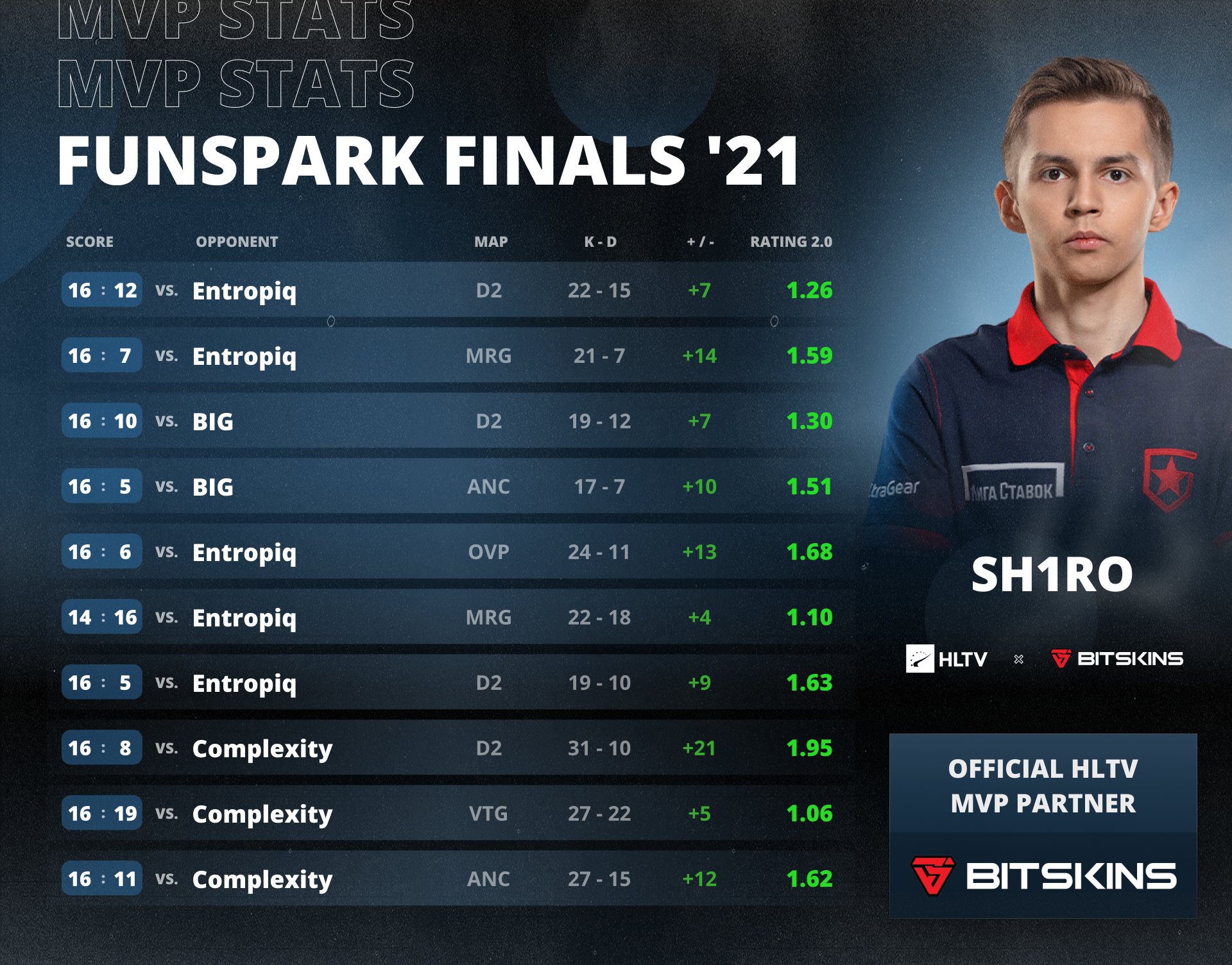 Gambit обыграла в финале турнира Entropiq со счетом 2-0. Rating 2.0 Sh1ro на Funspark за 10 карт составил 1,43 единицы. Лучшим выступлением снайпера на турнире стал его перфоманс на карте Dust 2 с 31 убийством в матче против Complexity (рейтинг 1,95).