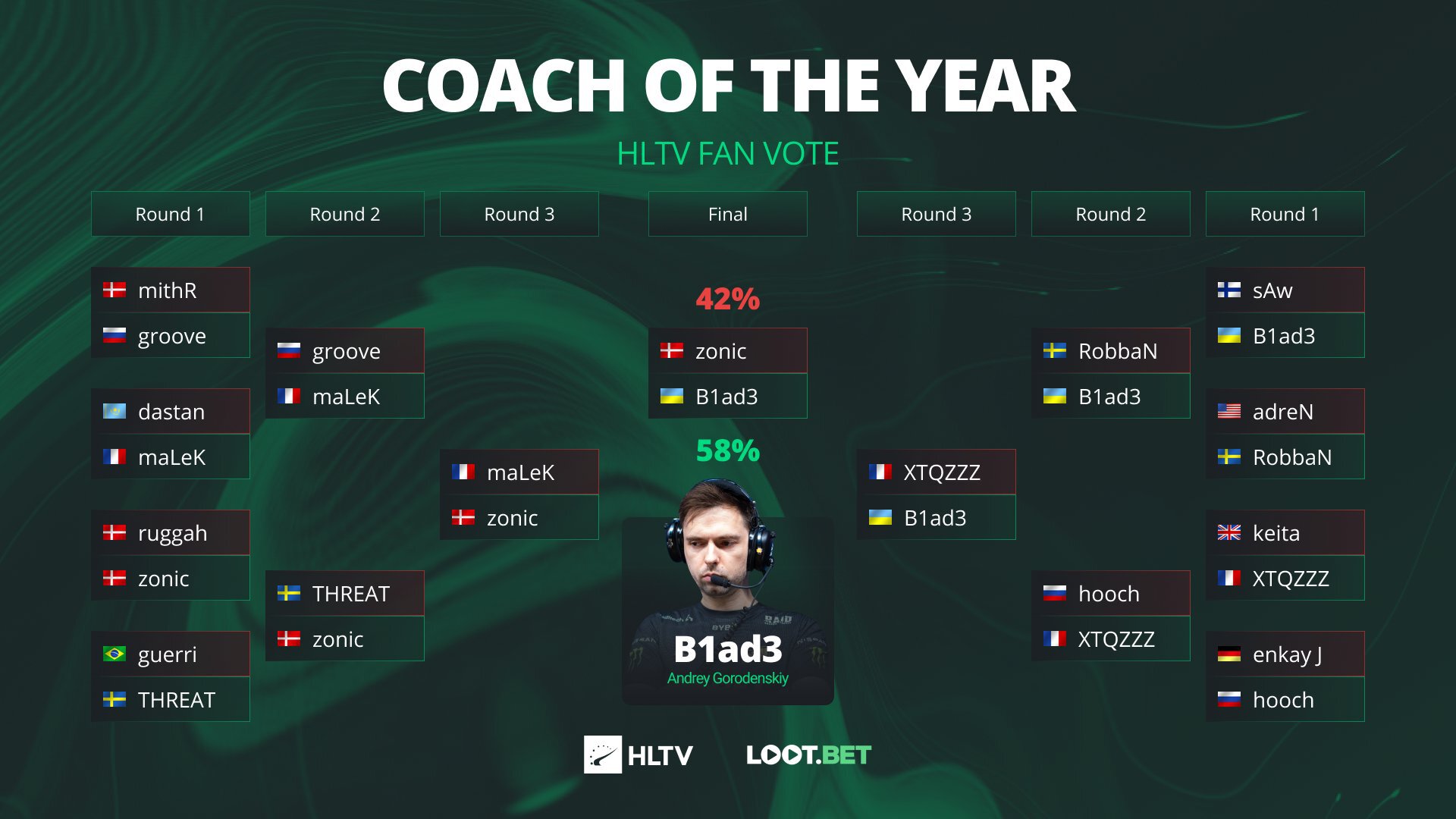 Победителем стал тренер NAVI Андрей «B1ad3» Городенский. Помимо него, в финал прошел экс-тренер Astralis Дэнни «Zonic» Соренсен, который в 2022 году перешел в Vitality. Итоговые голоса распределились следующим образом: 58% за Блейда, 42% за Зоника.