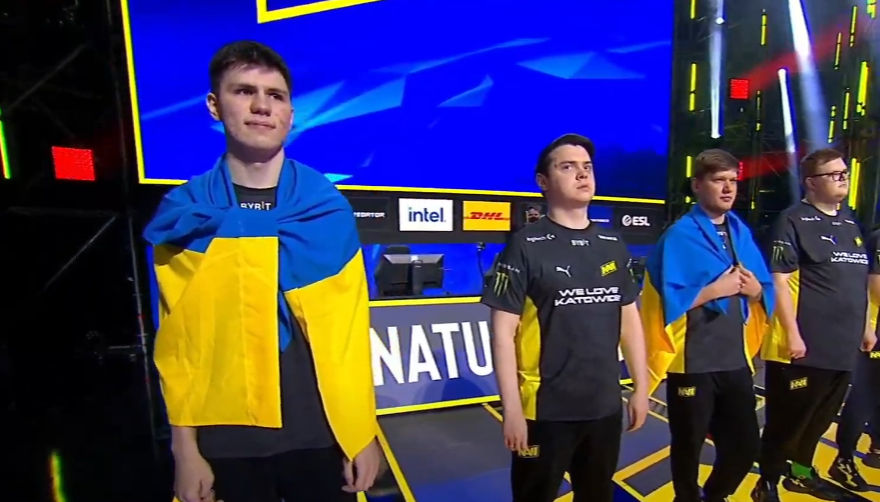 Игроки NAVI из Украины вышли с флагами страны на сцену IEM Katowice 2022.