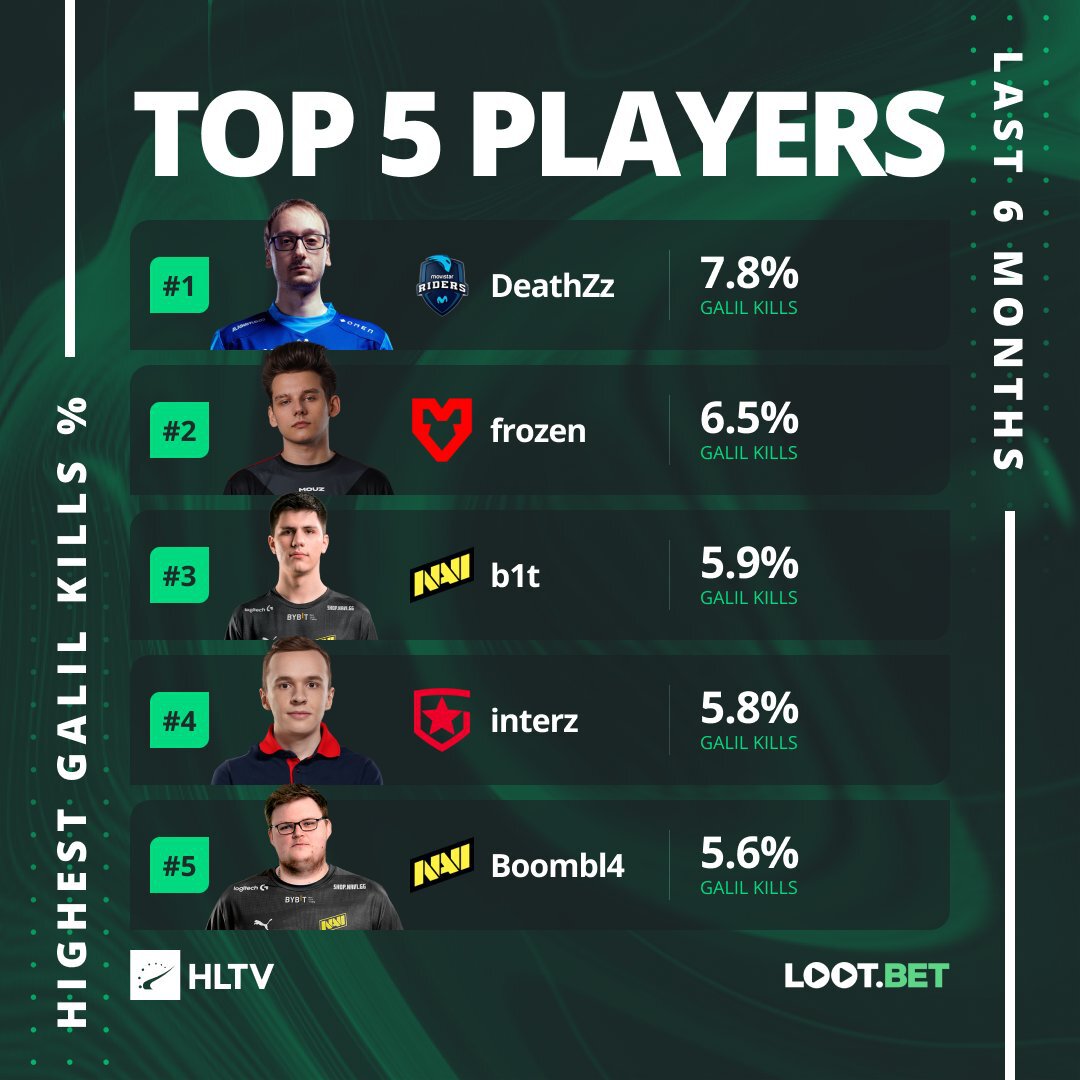 B1t (3-е место) и Boombl4 (5-е место) также вошли в топ-5 лучших игроков с Галилом.