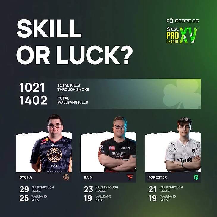 На ESL Pro League Season 15 Павел «dycha» Дыха сделал больше всех убийств вслепую: 29 – через дым, 25 – прострелами.