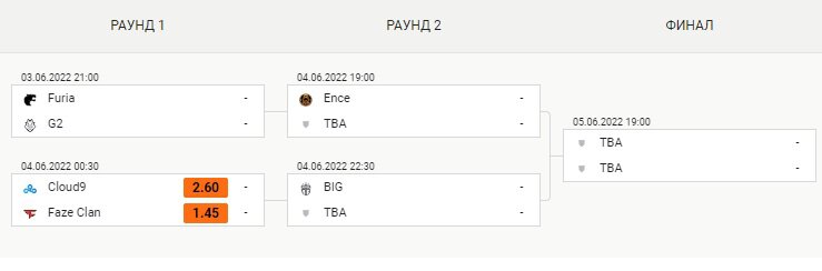 Борьбу за чемпионство продолжат Cloud9, Furia, G2, Faze, ENCE и BIG. Плей-офф пройдет в формате сетки Single Elimination, матчи – best-of-3, гранд-финал – best-of-5.